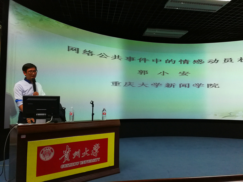 5月25日下午,由贵州大学哲学社会科学研究院主办、文学与传媒学院承办的贵州大学总第405期文科讲坛(2017年第29期)在我校北校区慎思楼情境模拟实验室举行。重庆大学新闻学院博士生导师郭小安教授受邀作了“网络公共事件中的情感动员机制”专题讲座。讲座由文学与传媒学院副院长刘振宁教授主持。