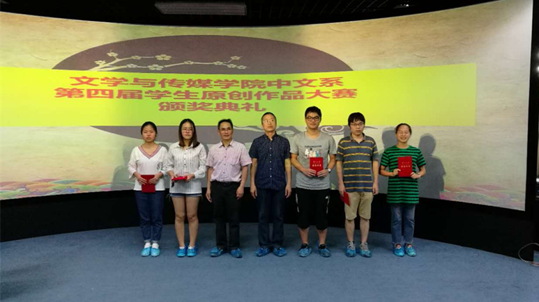 第四届原创作品大赛,中文系学生踊跃参赛,共收到参赛作品二百余件,大赛评委会共评出一等奖3名,二等奖6名,三等奖12名,优秀奖30名。典礼上,学院领导和老师依次为获奖同学颁发荣誉证书并合影留念。