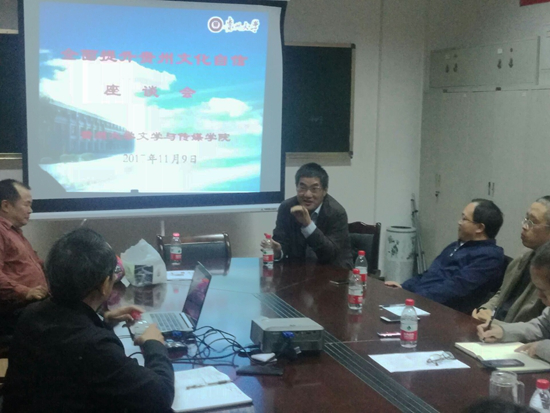 胡芳教授介绍了目前国内对文化自信的研究状况,谈到提升文化自信过程应该加强主流意识形态的指导。杨志强教授谈到,贵州是一个多民族文化共同发展的地区,每个民族都有自己独特的文化背景和文化成果,现在的贵州文化缺少主体性,各个民族之间缺少了一种大家都认同的文化,要想全面提升贵州的文化自信,必须先培养贵州人民的文化认同感。宋君修教授就如何提高贵州人民对自身文化的认同和对贵州原滋原味的民族文化保存表达了自己的看法。刘振宁教授谈到要注意从形象学和人类学视角加强对文化和文化自信的研究。李效文副教授认为,在未来的这几年时间里,红色文化将成为中国文化发展的主流,贵州应该抓住这个时机,大力弘扬贵州的红色革命文化,也要注意传播学最新技术对于我们树立文化自信的积极作用。谭德兴教授在发言中提到,现在的中国人在中西文化的碰撞之下,表现出了极不自信姿态,贵州文化的自信要重视经典著作的阐释,“要想全面提升我们的文化自信就必须回到中国传统的儒家文化中去,对经典进行重新阐释。” 付星星副教授、赵永刚副教授也分别就贵州文化自信要重视中华经典著作的传承、文化自信要有文艺风采做了发言。