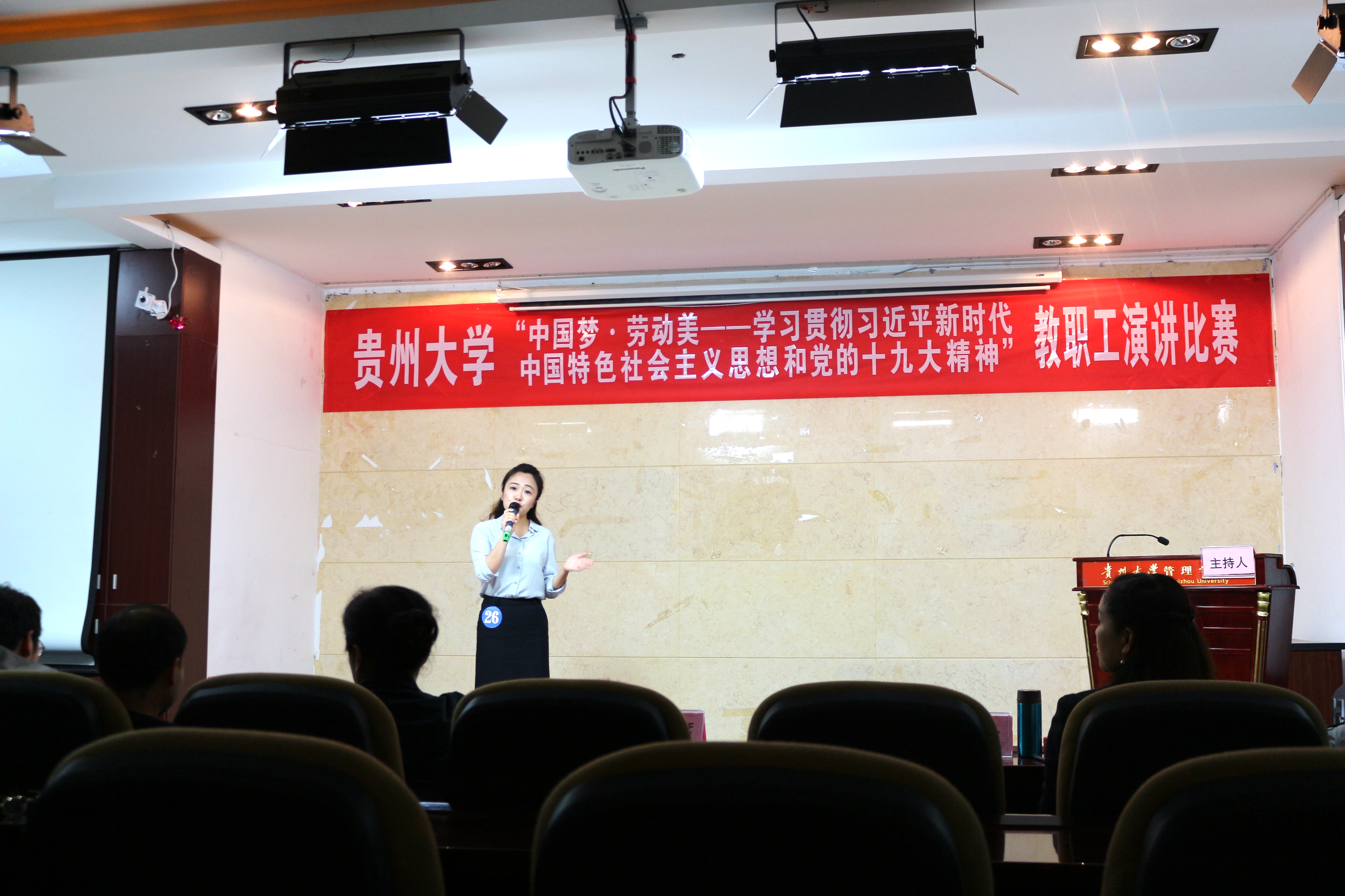 贵大记者团讯(记者团 蔡佳 马哲 报道|摄影 牛贤明)4月27日下午,“中国梦·劳动美――学习贯彻习近平新时代中国特色社会主义思想和党的十九大精神”教职工演讲初赛下半场,在我校管理学院三楼报告厅举行。此次初赛由我校党委组织部部长陈代勇,马克思主义学院副院长、教育部全国高校思政课教师年度影响人物李传兵,音乐学院教授、国家一级演员、曾为中央电视剧87版《红楼梦》的女主林黛玉的配音演员张爱玲担任评委。