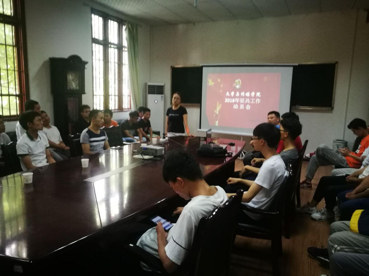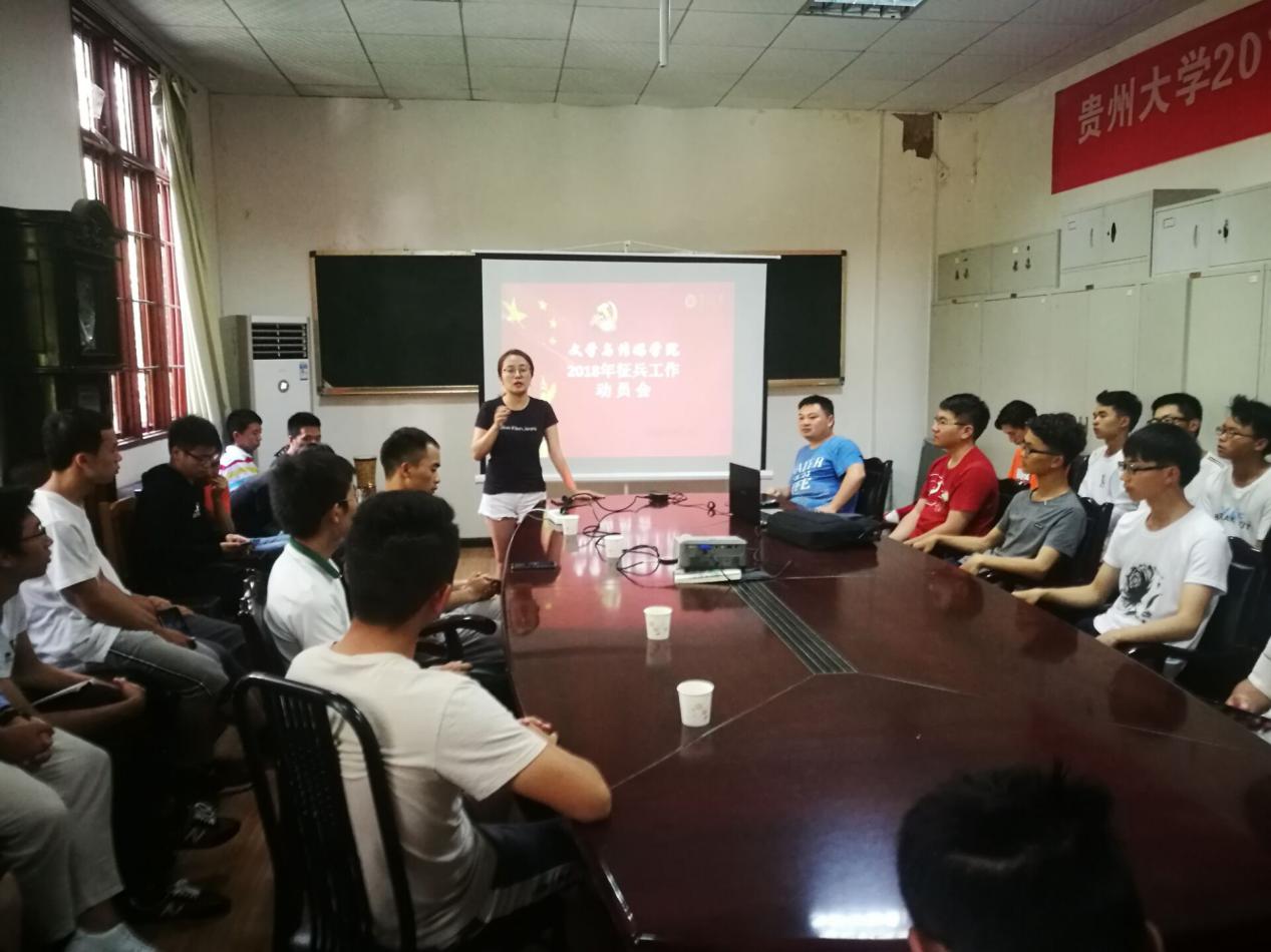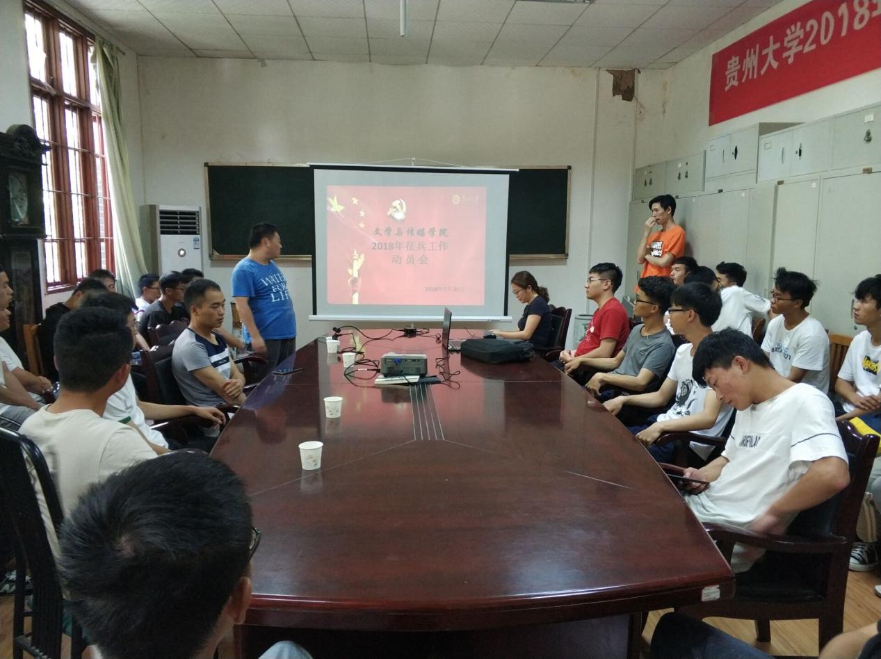 (文学与传媒学院 赵恒锋 摄影 报道)8月1日,贵州大学文学与传媒学院辅导员吴卿、王婷婷组织召开了“贵州大学文学与传媒学院2018年征兵工作动员会”,学院所有男同学参加会议。本次征兵工作动员会既旨在宣传大学生应征入伍各项政策,又在于鼓舞同学们携笔从戎,献身国防事业。