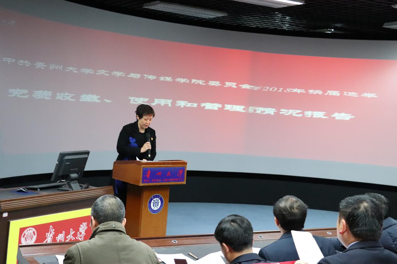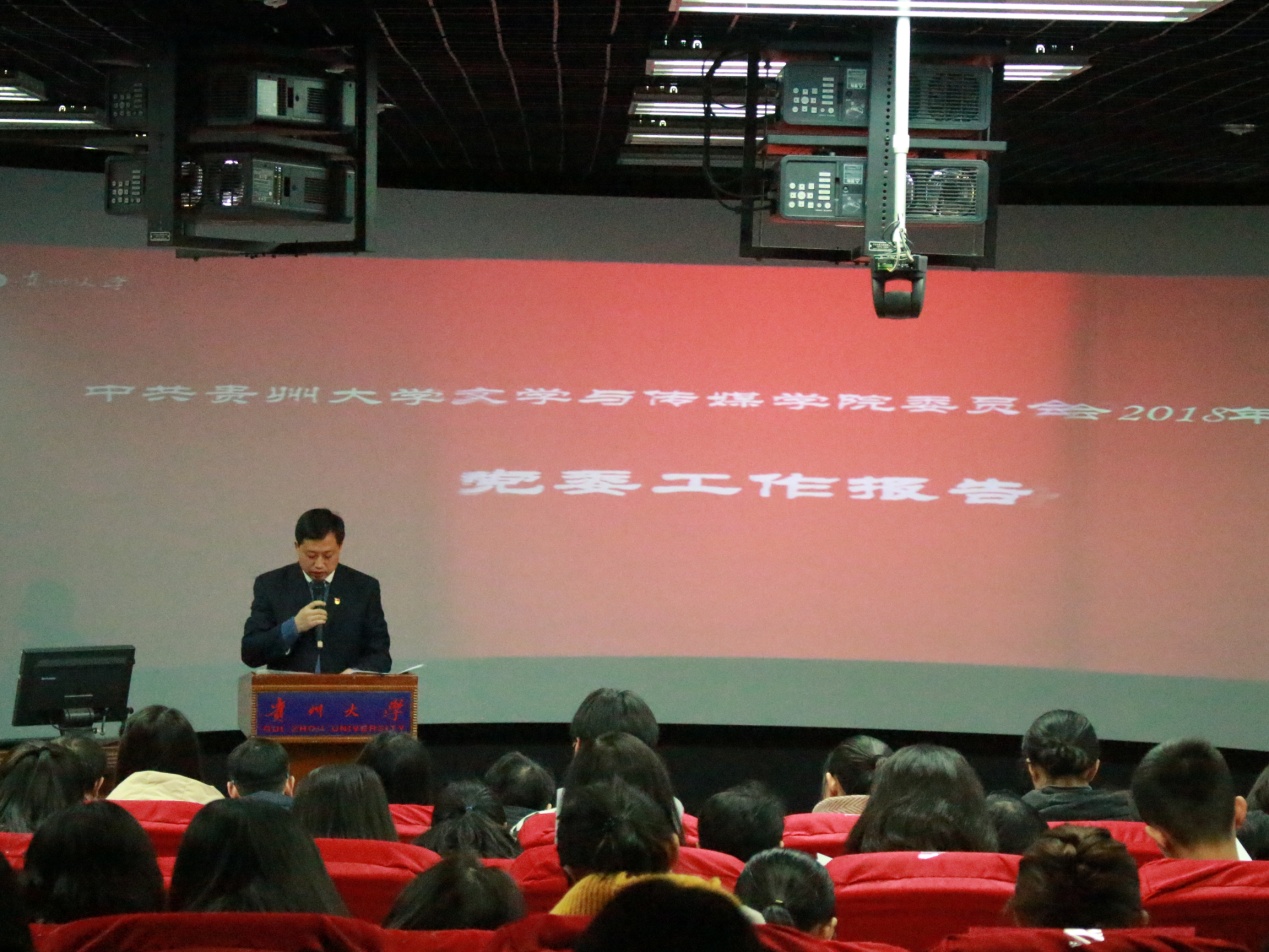 副院长谭德兴主持第一阶段会议。学院党委书记罗卫刚作《中国共产党贵州大学文学与传媒学院委员会工作报告》,学院党委副书记董蔚然作《中国共产党贵州大学文学与传媒学院委员会党费收缴、使用和管理情况报告》,并提交全体正式党员审议。