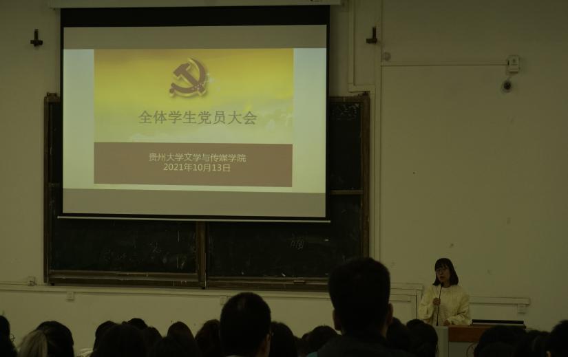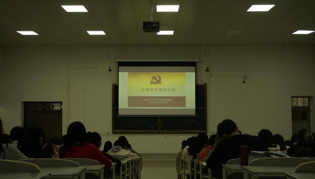2021年10月13日下午,贵州大学文学与传媒学院全体学生党员大会在法阶一召开。文学与传媒学院党委书记李开学、党政办公室主任方芳、学生科科长王婷婷、本科生思政辅导员张健、曹家鹏出席本次会议。会议由文学与传媒学院党委组织委员姬丹主持,文学与传媒学院本科生第一党支部、本科生第二党支部、研究生第一党支部及研究生第二党支部全体党员参加。