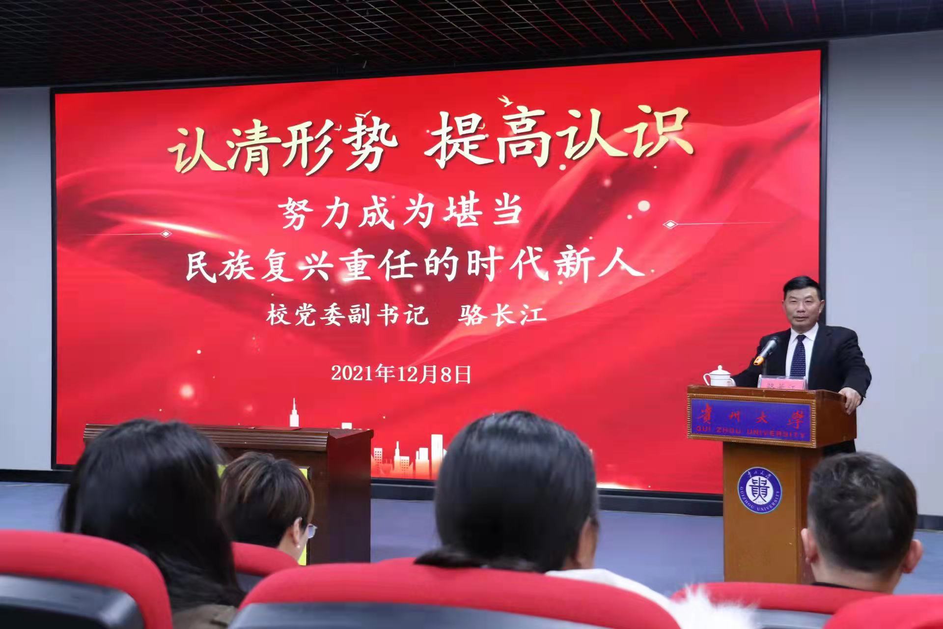 骆长江指出,要认清形势,首先必须认清“两个大局”,即世界百年未有之大变局,中华民族伟大复兴的战略全局。他结合100余年来世界发生的重大事件、重大灾难、重大变革,详细阐述了世界百年未有之大变局。通过回顾100年来中国人民在中国共产党领导下取得的伟大成就,中华大地发生的沧桑巨变,强调“我们比历史上任何时期都更接近、更有信心和能力实现中华民族伟大复兴的目标”,引导师生只有认清形势才能提高认识,明确目标,立志成才,担当使命。