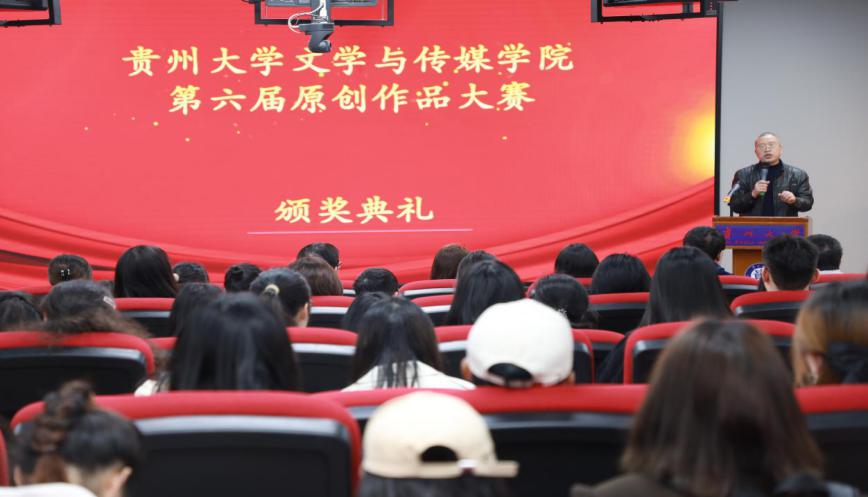 2022年3月10日,贵州大学文学与传媒学院在情景模拟实验室举行了第六届原创作品大赛颁奖典礼。莅临本次颁奖典礼的嘉宾有文学与传媒学院党委书记李开学,文学与传媒学院院长谭德兴,文学与传媒学院党委副书记、副院长唐娟。文学与传媒学院教学科研科科长郭付利主持此次颁奖典礼。