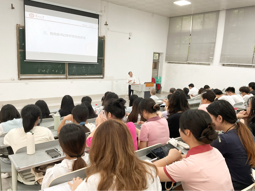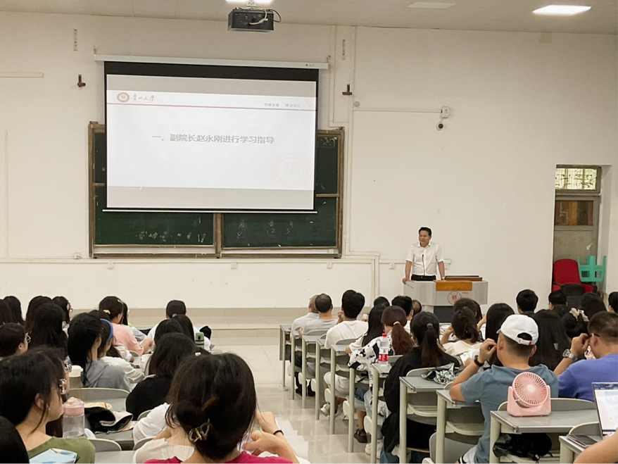 2023年8月21日下午,贵州大学米兰体育·(中国)官方网站于法学楼101DT召开2020级本科生年级大会暨考研推进会。学院党委书记李开学、副书记院长谭德兴、副书记副院长赵永刚、教学科科长郭付利、本科生思政辅导员曹家鹏及全体2020级本科生参加本次会议。会议由辅导员曹家鹏主持。