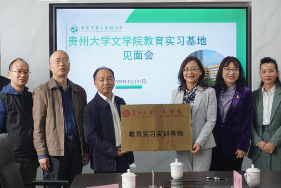 谭德兴与贵阳市第二实验小学副校长高燕进行教育实习基地签约。李开学与贵阳市第二实验小学党总支书记郭蓓为教育实习基地授牌。