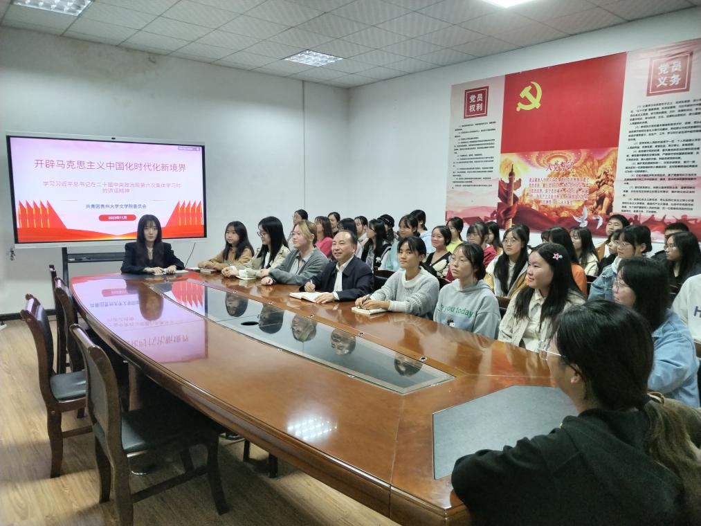 汉语2203班团支部书记杨欣子怡带领班级同学一起深入思考开辟马克思主义中国化时代化新境界这一重大任务与青年的关系,她说,同学们必须坚持不懈用习近平新时代中国特色社会主义思想这一创新理论武装头脑、指导实践、推动工作,才能更好地为全面建设社会主义现代化国家贡献青春力量。