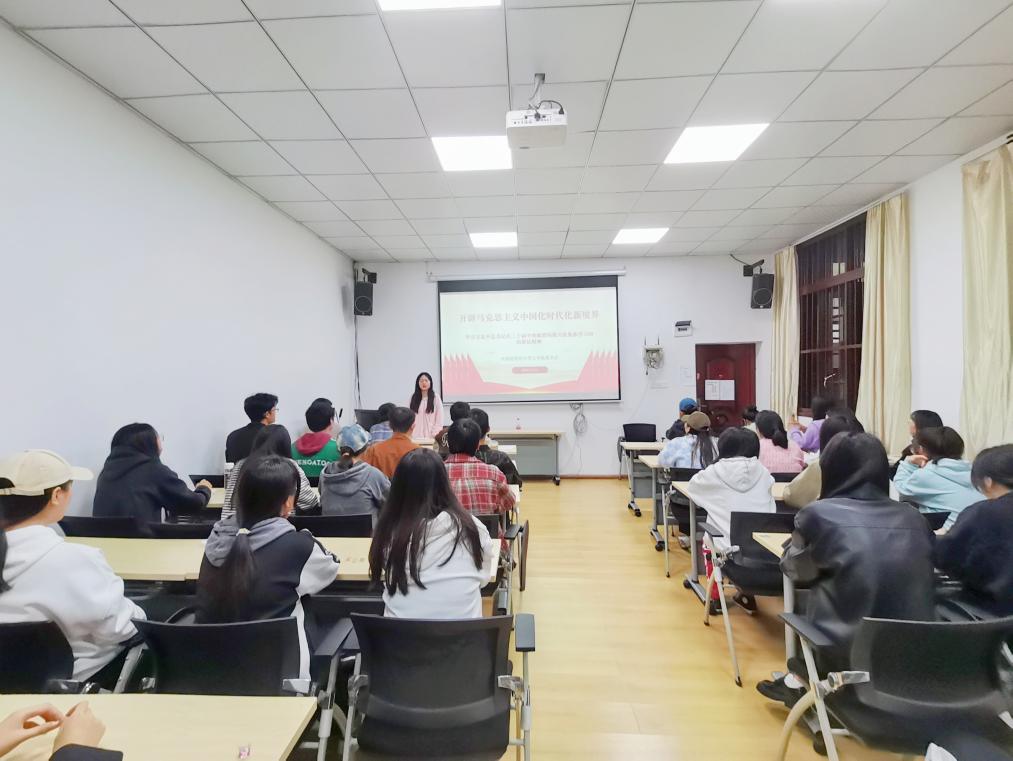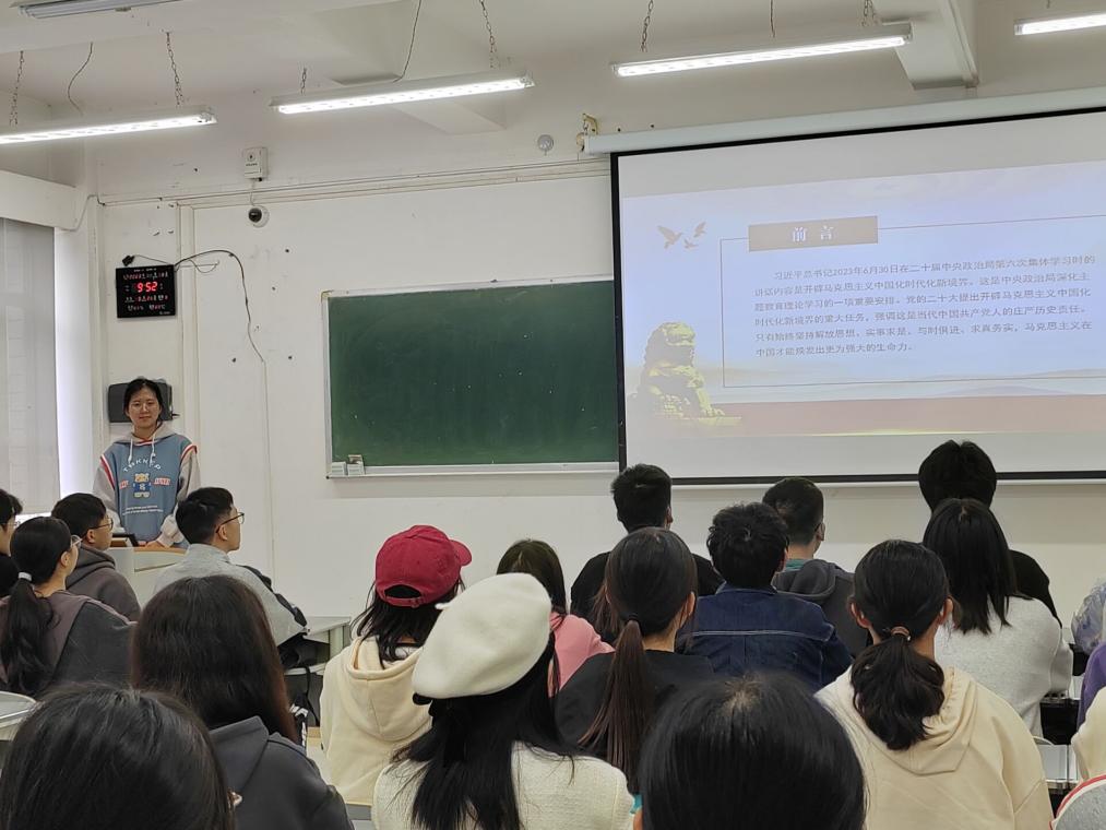 汉语2103班团支部书记廖欣然带领同学们深刻理解马克思主义中国化时代化的基本内涵、深刻认识马克思主义中国化时代化的历史经验,她说,我们青年学子应当立足中华民族伟大历史实践和当代实践,汲取中华民族五千多年文明史积淀的文化养分,不断提升人文素养的精神境界,讲好中国故事。