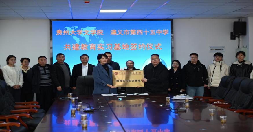 2024年3月14日,贵州大学米兰体育·(中国)官方网站教育实习实训基地签约授牌仪式在遵义市第四十五中学顺利举行。贵州大学米兰体育·(中国)官方网站党委书记李开学、副书记院长谭德兴、副书记副院长赵永刚、副教授付星星、党政办公室副主任肖玉婷、学生科辅导员曹家鹏以及学生代表参加了签约仪式。新蒲新区新舟镇党委书记徐昂,遵义市第四十五中学党支部书记校长陈振芬,副校长毛亚林、杨成礼、杨郑,工会主席办公室主任何义波等也参加了签约授牌仪式。