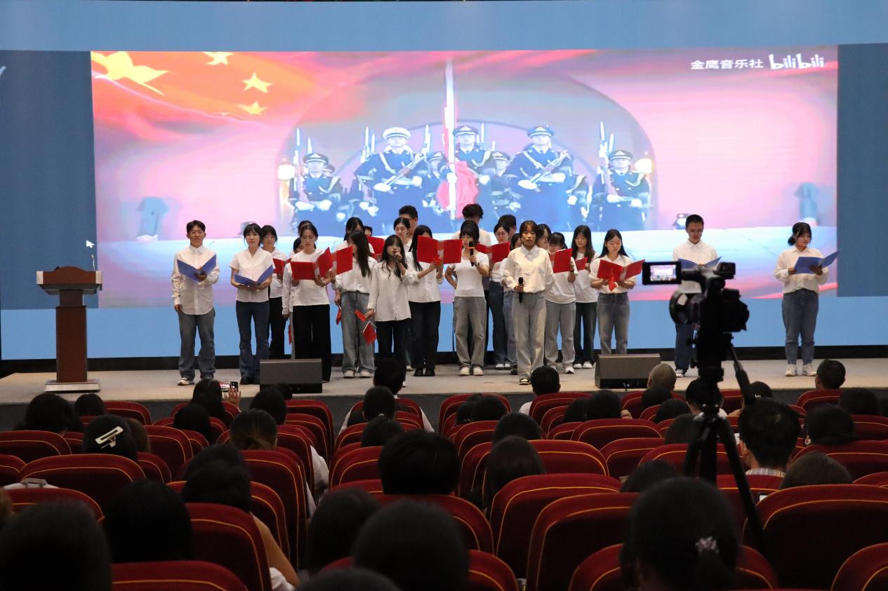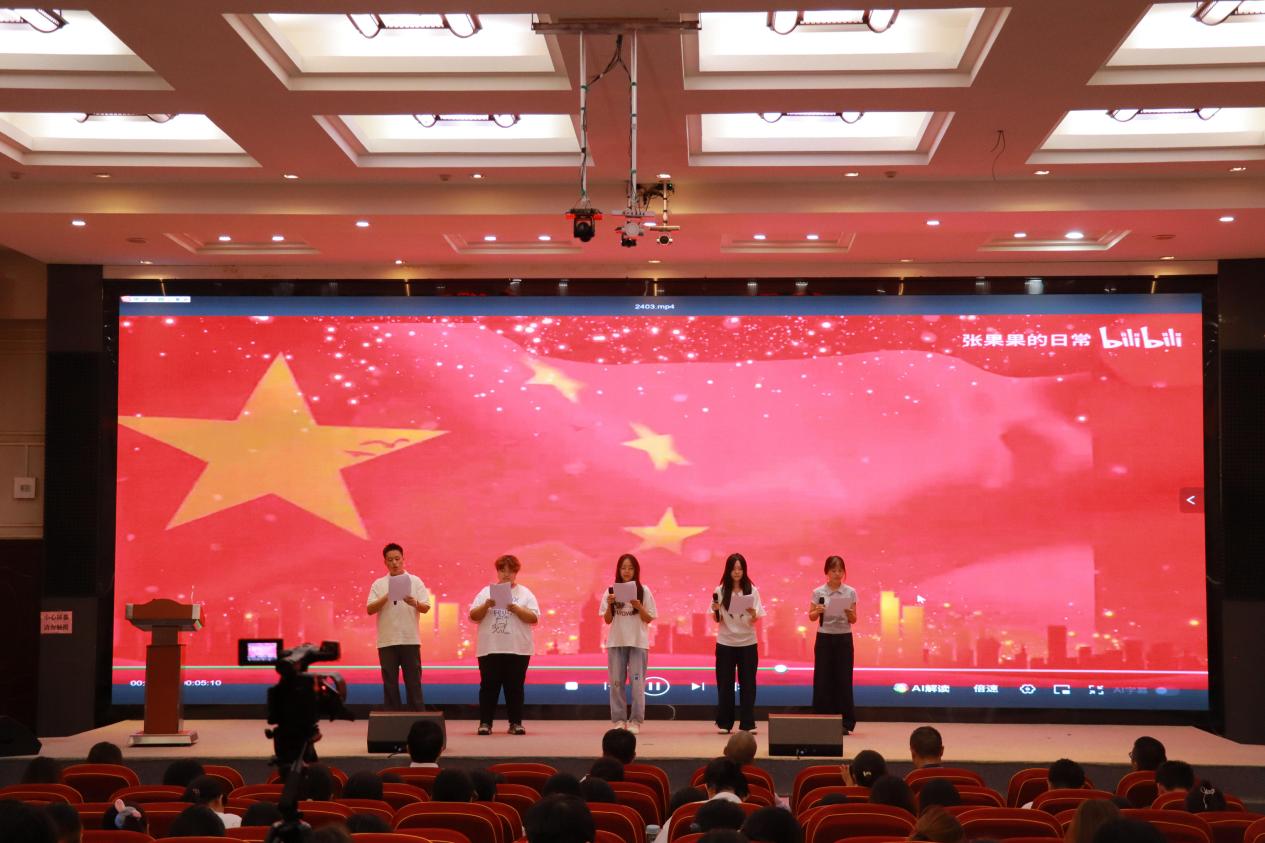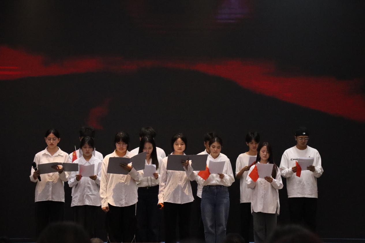 汉语言文学2302班深情朗诵欧震作品《不朽》,以声绘境,将观众带回那个战火纷飞的年代——“那个夜晚,我在台灯下读着抗战英雄的故事……我仿佛看见了那些倒下的战友,血染的军装、泥土、山岗”。朗诵者用沉郁而激昂的语调,再现英雄壮举,传递跨越时空的精神力量,令人动容;汉语言文学2403班则以饱满的深情演绎《我的祖国》,诵声中尽显山河壮丽与家国情怀,一字一句皆流淌着对祖国深沉而炽热的爱,充分展现了新时代青年对祖国的无限赞美与真挚情感。