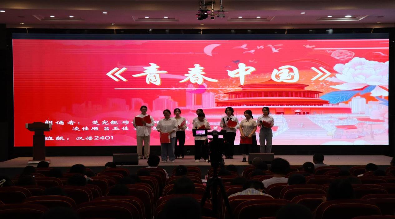 “用茫茫的夜色作墨,用疮痍的土地作纸……在鸦片战争的硝烟之后,是谁?写下的两个字——中国……”汉语言文学2401班同学深情演绎《青春中国》,铿锵有力的诵读瞬间将观众带入那段艰难而光辉的岁月;汉语言文学2301班带来《这盛世如您所愿》,表达新时代青年对先辈的告慰与对未来的坚定信念“在复兴的道路上,我们乘风破浪……民族复兴的使命有我担当”;汉语言文学2404班则以《可爱的祖国》抒发赤子情怀:“我自豪你的悠久,数千年的狂风吹不折你挺拔的脊背……我自豪你的坚强,抵住内忧外患闯过岁月蹉跎”,句句饱含对祖国深沉的敬意与自豪。