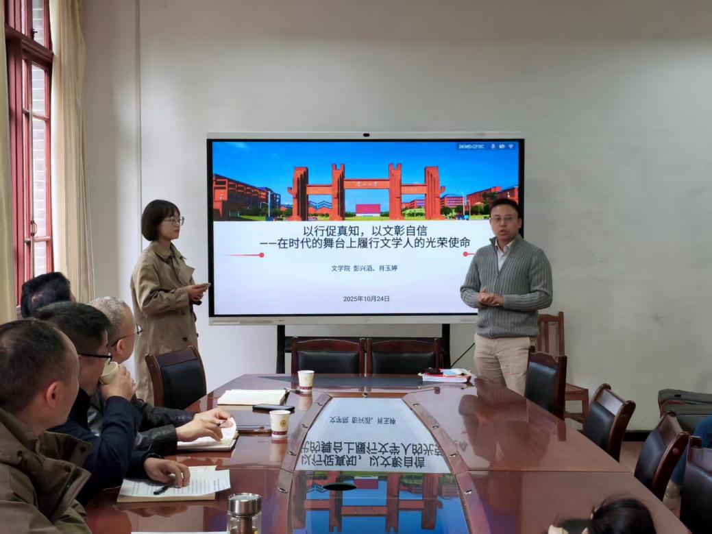 为深入学习贯彻习近平新时代中国特色社会主义思想,推动文化育人、实践育人走深走实。2025年10月24日中午,米兰体育·(中国)官方网站举办“以行促真知,以文彰自信——在时代的舞台上履行文学人的光荣使命”理论宣传二人讲活动。本次活动由教工党支部书记彭兴滔、党政办公室副主任肖玉婷两位老师主讲,围绕新时代文学人的使命担当,系统阐述了米兰体育·(中国)官方网站在人才培养、文化传承与服务社会方面的探索与实践。