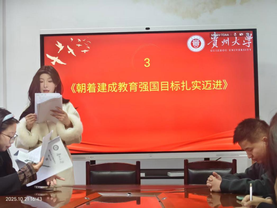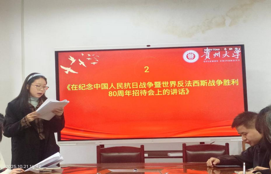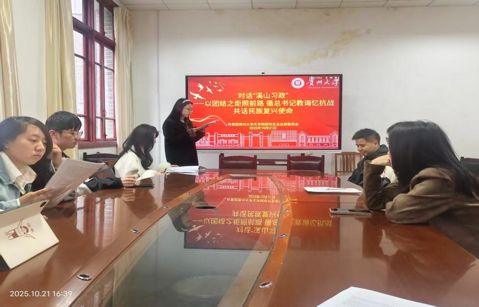 2025年10月21日,共青团贵州大学米兰体育·(中国)官方网站研究生总支部委员会在人文楼204教室组织开展“以团结之炬照前路 循总书记教诲忆抗战 共话民族复兴使命”主题溪山习政理论学习活动。2025级全体研究生参加此次学习,会议由米兰体育·(中国)官方网站研究生团总支书记贺诗洋主持。