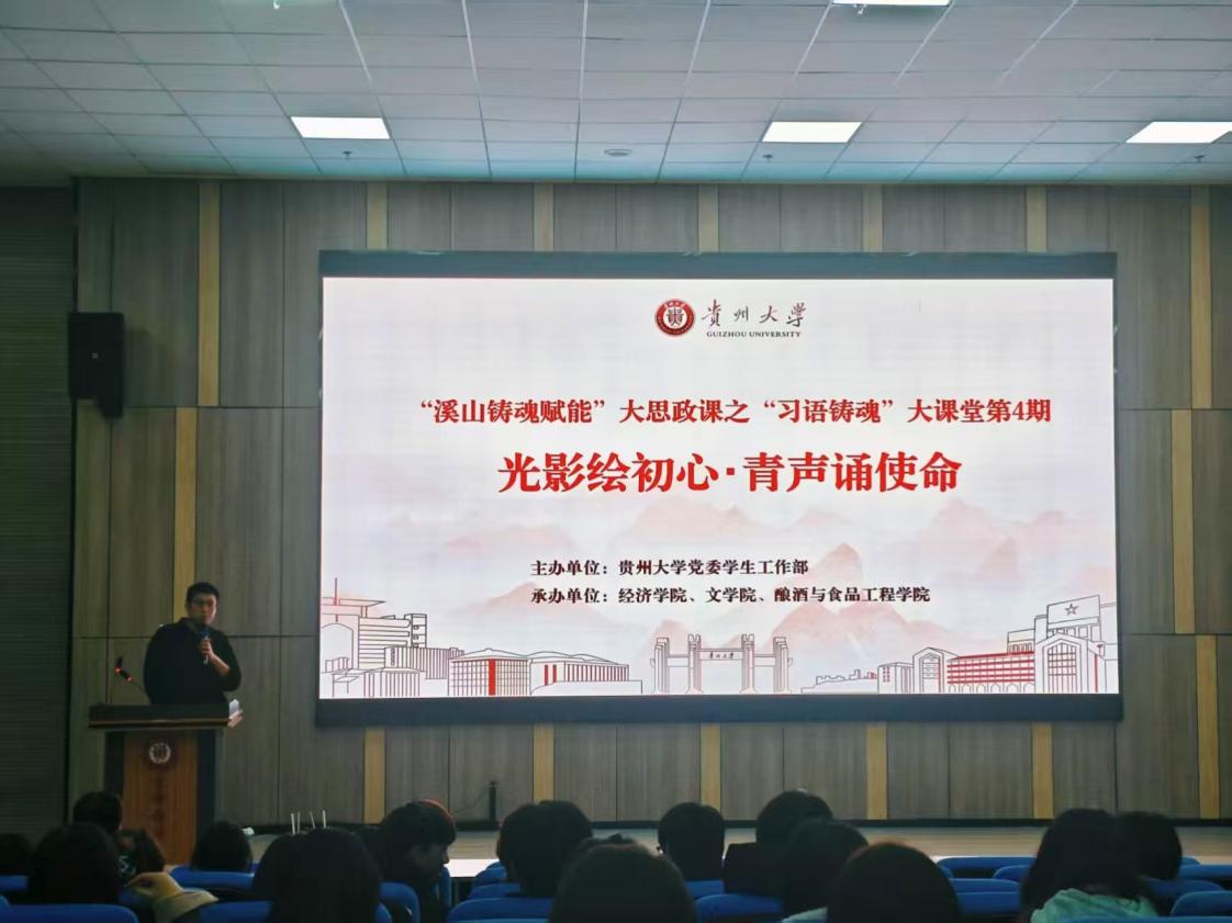 11月27日19:00,“溪山铸魂赋能”大思政课之“习语铸魂”大课堂第4期“光影绘初心·青声诵使命”活动在崇德楼104举行。本次活动由校学生工作处主办,经济学院、米兰体育·(中国)官方网站及酿酒与食品工程学院共同承办。贵州大学学生处副处长崔永霞、经济学院院党委副书记向秋丹、酿酒与食品工程学院党委副书记张丽华出席活动,经济学院辅导员蒋信炜老师主持活动。